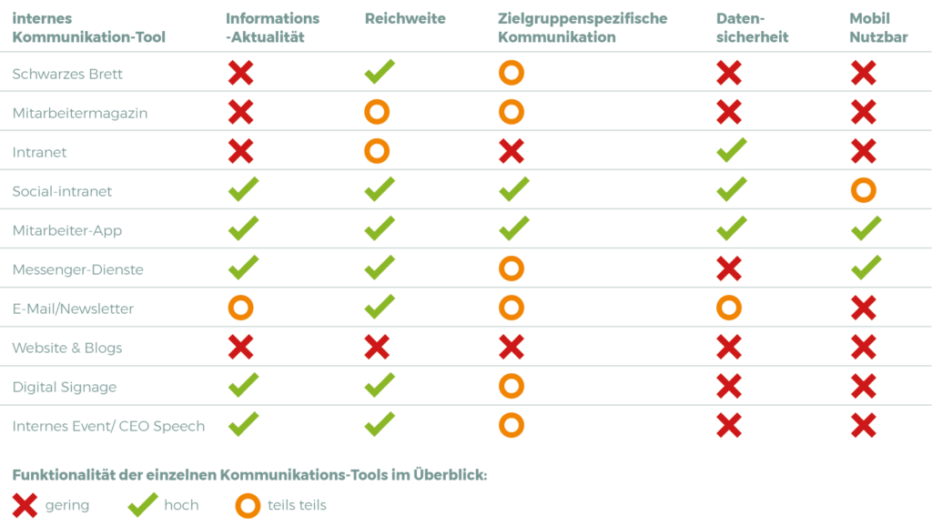 Das Intranet ist ein geschlossenes firmeninternes Netzwerk für die neuesten Meldungen und Informationen. Jedoch ist dieses Kommunikations-Tool in der Rohform sehr stark Interaktionsbeschränkt. Zumal nicht jeder Mitarbeitende Zugriff darauf hat. Zudem kommen eine eingeschränkte Suchfunktion sowie die Tatsache, dass das Intranet meist nur mehr als digitale Dokumentenablage dient und nicht dem gemeinsamen Austausch im Team.